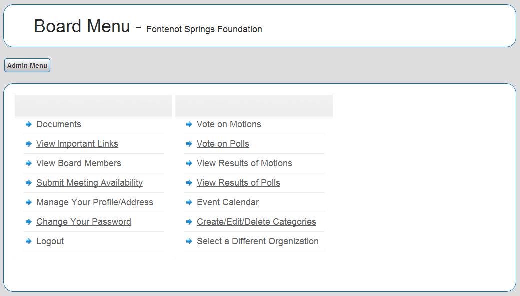 Board members are not supposed to be closet-techies. Instead, they need to bring their experience, expertise, and vision to bear on the important decisions that will shape their organization's future. BoardGPS helps board members fulfill their important decision-making roles more productively. It also helps them avoid getting bogged down with issues caused by unfamiliar or obscure technology. Anyone with the ability to operate a web browser can get up to speed fast with the simple and straightforward menus presented by BoardGPS -- that usability makes the site a true "Group Productivity System" (GPS) for busy board members!